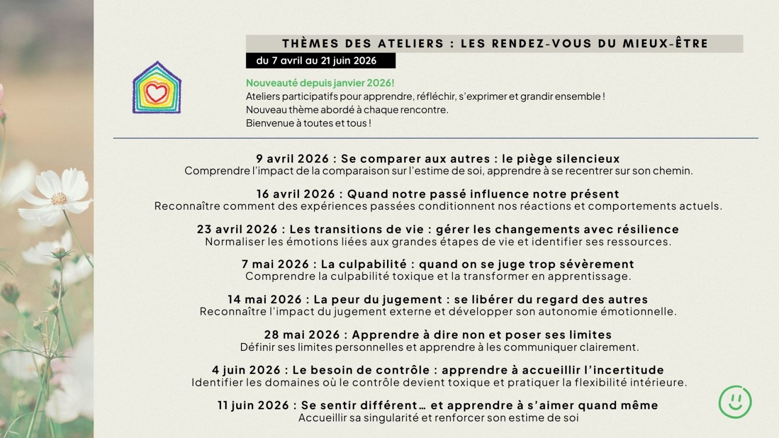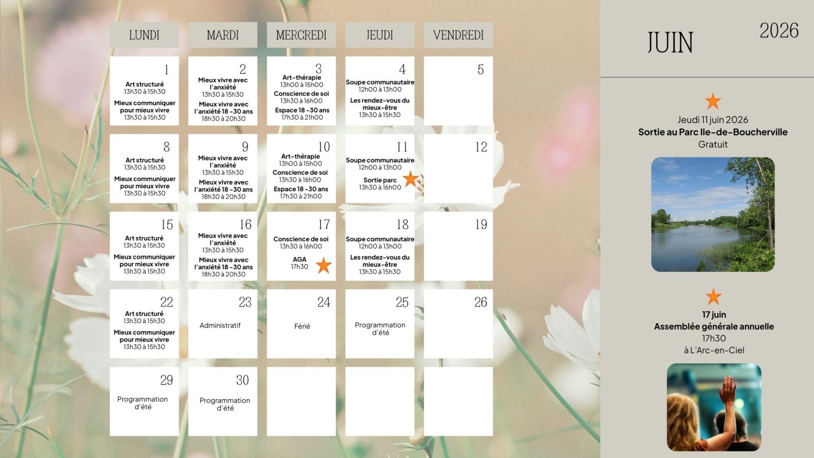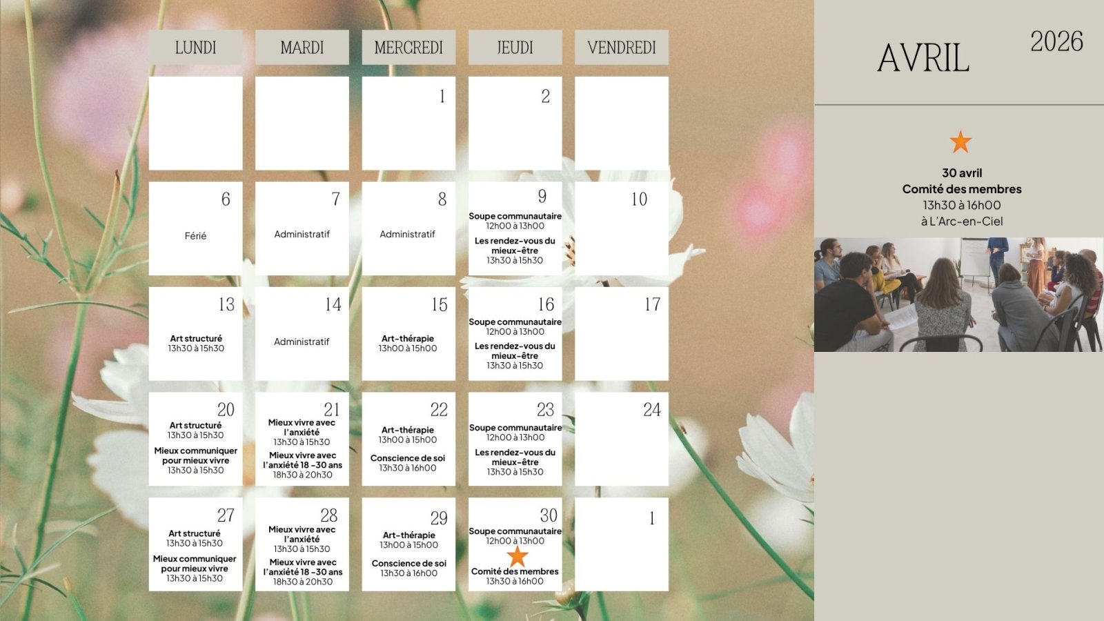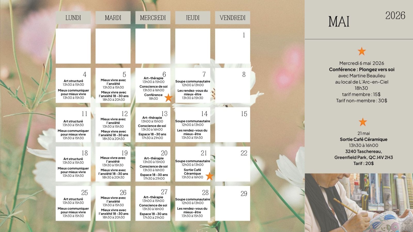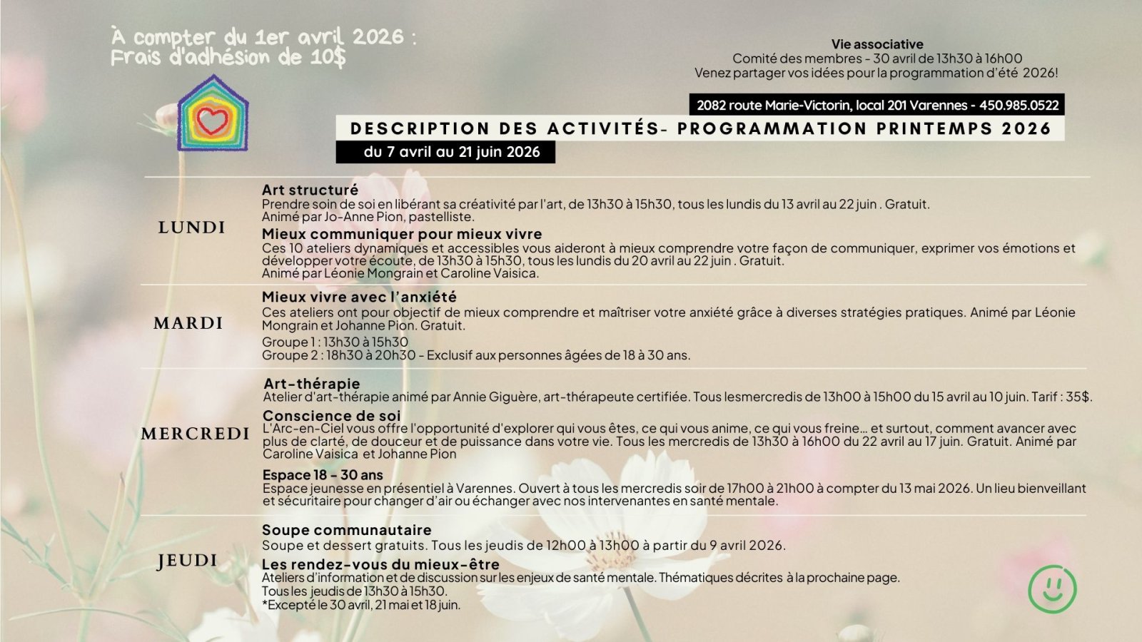 Voici le calendrier de la programmation du printemps 2026 à L'Arc-en-Ciel, du 7 avril au 21 juin. Pour visualiser l'ensemble de nos activités, consultez notre publication « Détails de la programmation du printemps 2026 ».